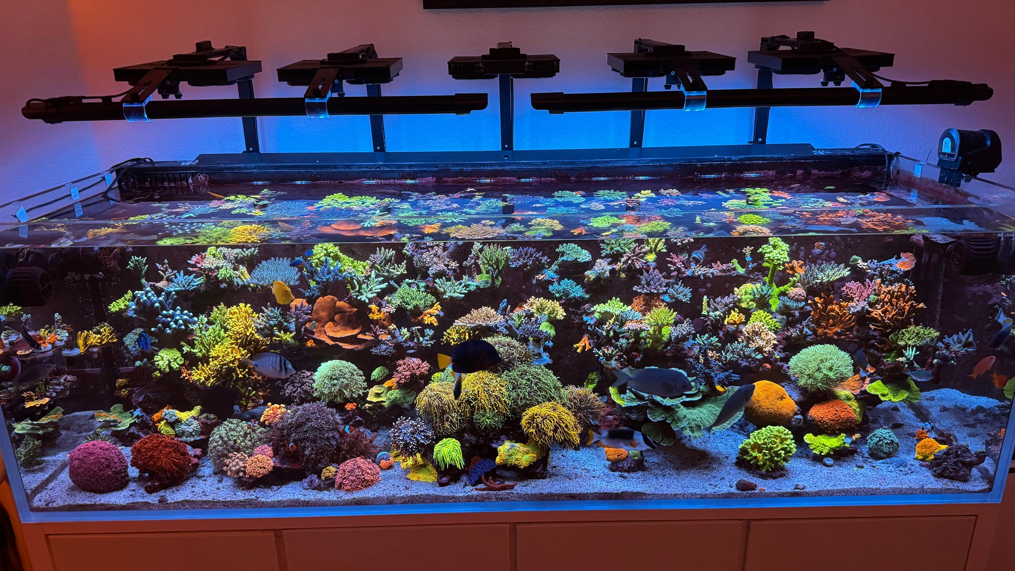 What started as a dedicated SPS system has evolved into something much more dynamic. Large LPS colonies now fill in the structure, adding movement and contrast, while a wide variety of colorful fish bring the entire tank to life.